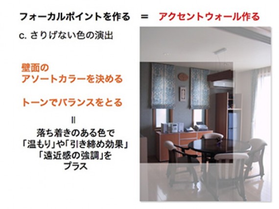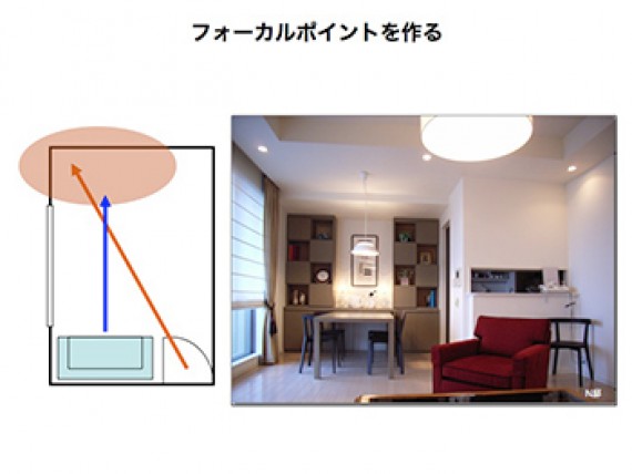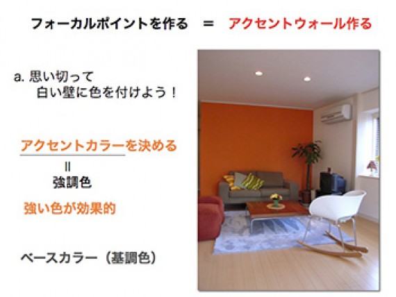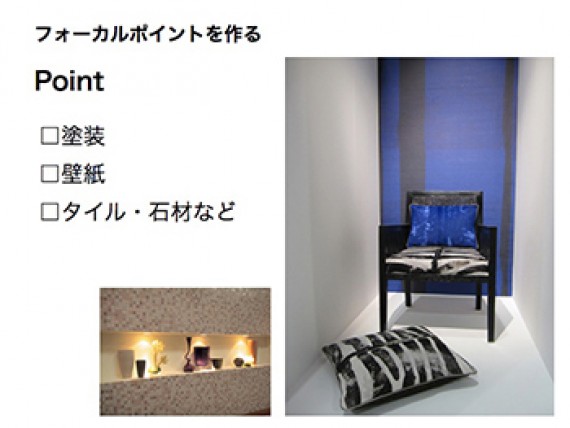 空間に「フォーカルポイント」=「見せ場」を作ると部屋は一気にグレードアップします。入口(ドア)から部屋に入った時、遠い壁面を人はまず目にします。その周辺の壁面にフォーカルポイントになる家具や装飾を施すと、部屋の第一印象は格段に良くなります。部屋全体、家全体を素敵に飾り付けるのは実際には難しいことです。また、インテリアで大切なのはバランスです。360度装飾や色で溢れていたら落ち着きの無い部屋になってしまいます。そこで最も効果的な場所をバランス良く装飾する。それが色や柄を効果的に使うポイントにもなるのです。