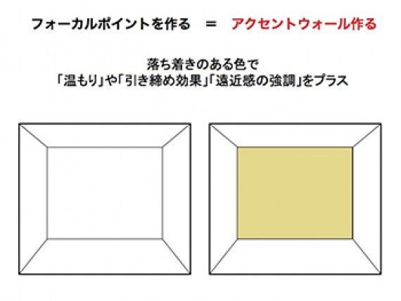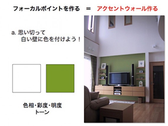 フォーカルポイントの作り方はいくつかありますが、住宅を新築、もしくはリフォームする際お勧めなのが、フォーカルポイントとなる壁に色を大胆に使う方法です。これは家具や装飾品を買って飾るよりずっとリーズナブルで簡単です。そして効果的に出来る方法です。部屋全体のすべての壁面に色を使うことも出来ますが、白い空間に一カ所色を使うことでアクセントが生まれ、フォーカルポイントに生まれ変わります。その際は是非、白に近い薄い色ではなく、少し強い色にチャレンジしてみて下さい。