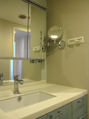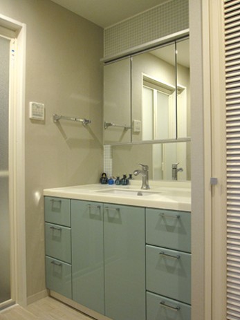 お風呂や洗面所、トイレも家の中では重要なリラックス空間です。白の清涼感ある内装も素敵ですが、壁や建具などに色を用いることで「特別な空間」が生まれます。ここではそんな事例のひとつをご紹介します。洗面所の壁面に暖色系のグレーの壁紙を用い、洗面化粧台には、カウンター材のオフホワイトカラーが映えるよう、アンダーキャビネットの扉にアクセントカラーをつけ、鏡面仕上げにしました。狭い空間にも色を数色使うことでアクセントを付け、グレイッシュなトーンで統一してバランスを取っています。
