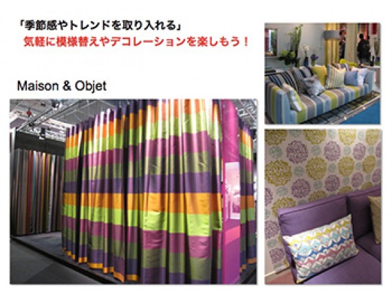 最近プリント柄がまた人気の兆しを見せています。カーテンに無地を使っていた人は、思い切って柄物の生地にチャレンジしてみましょう。そして椅子のカバーが汚れてしまったという人は、張替えをしてみませんか?大きなソファーはベーシックカラーにして、オットマンや1人掛け用のパーソナルチェアに個性的な生地を使えば、さりげなく、けれど効果的に模様替えが出来ます。空間に彩りのアクセントを加えることで、殺風景だった部屋が見違えるように明るく個性豊かになるでしょう。
