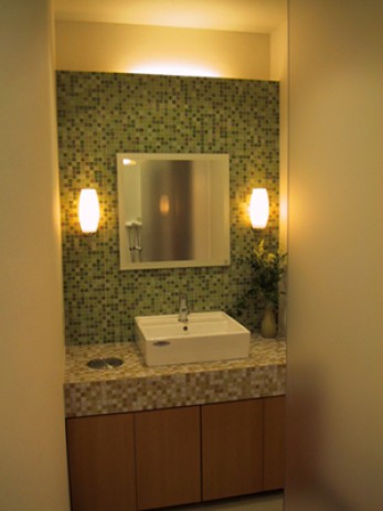 待合室の壁面や洗口コーナーにはガラスのモザイクタイルを用いて色のグラデーションと質感を楽しみます。