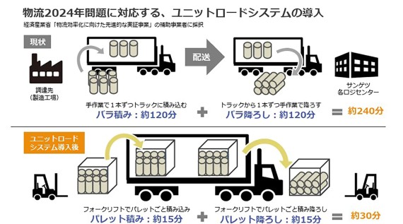 株式会社サンゲツ:特許取得の「Vパレ™」を採用した独自のユニットロードシステムで、積み込み・積み降ろしの作業時間を約87.5%短縮
